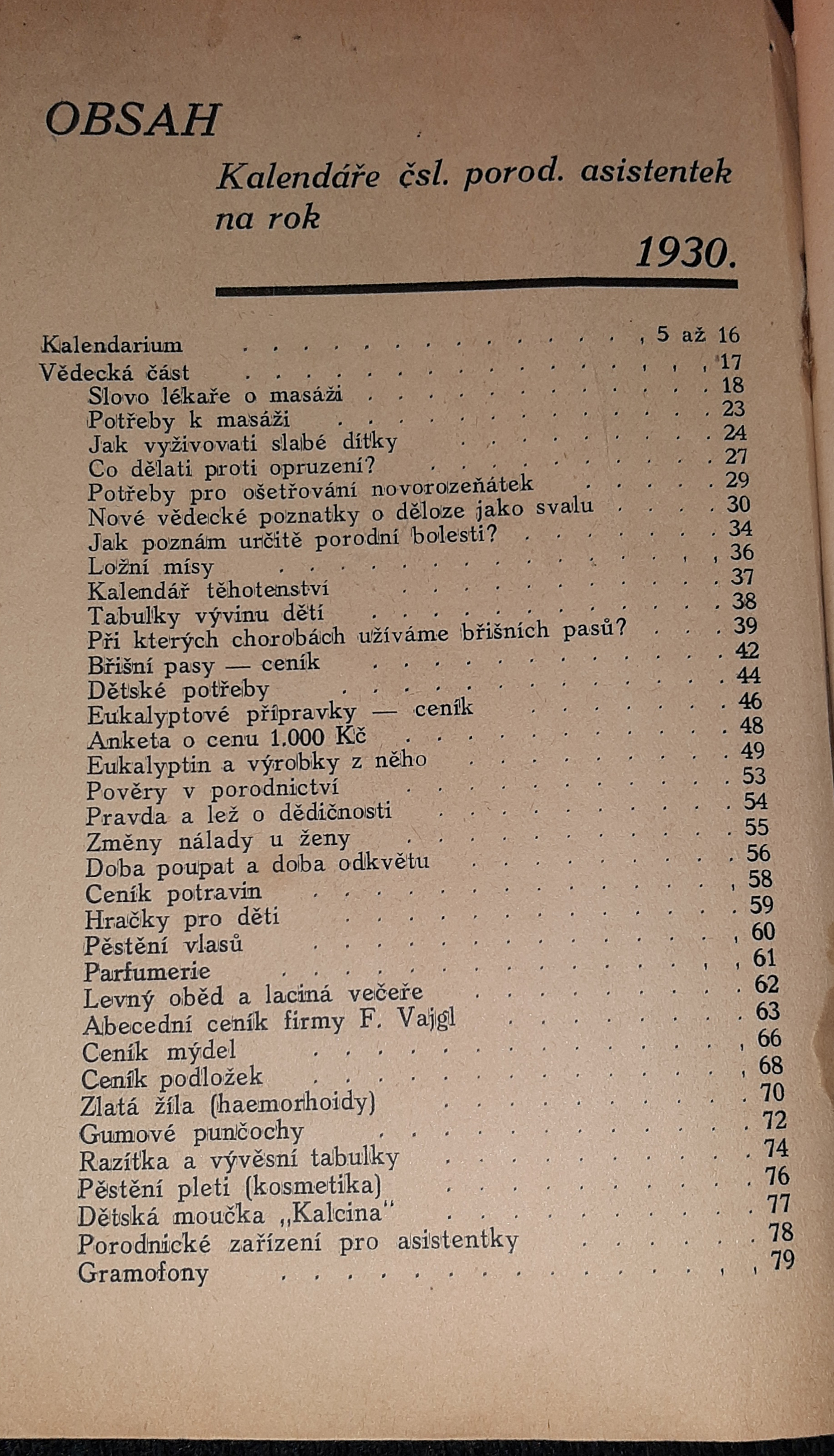 Další historickou zajímavostí je Kalendář ČSL porodních asistentek z roku 1930. Autorem je opět pan František Vajgl, majitel obchodu pro porodní asistentky. V brožuře se uvádí, že je to již šesté vydání. K nám se bohužel dostal pouze tento jeden jediný kousek. Libí se Vám? Budeme rádi za zpětnou vazbu.